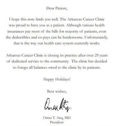 Recently, he sent out holiday greeting to his patients. The letter said, “I hope this note finds you well. The Arkansas Cancer Clinic was proud to serve you as a patient. Although various health insurances pay most of the bills for majority of patients, even the deductibles and co-pays can be burdensome. Unfortunately, that is the way our health care system currently works. Arkansas Cancer Clinic is closing its practice after over 29 years of dedicated service to the community. The clinic has decided to forego all balances owed to the clinic by its patients. Happy Holidays.”