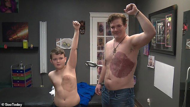 So Derek Sr. decided to go to Juicy Quill Tattoo to get the tattoo done! And the amazing father endured about 30 hours and nine sessions of painful tattoo sessions to get a tattoo on his chest identical to his son’s birthmark.