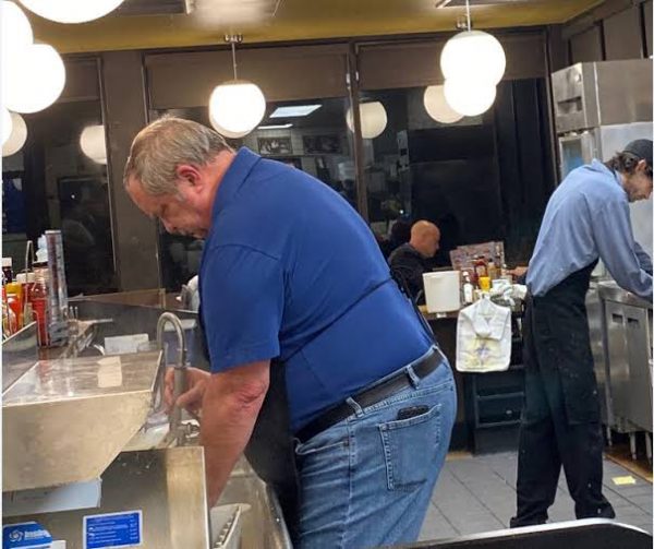 Crispo noticed Ben speak to a customer in a nice blue shirt seated at a counter. Then, he noticed Ben hand over an apron to him and in the next instant, the customer jumped in and started doing the dishes to help Ben!