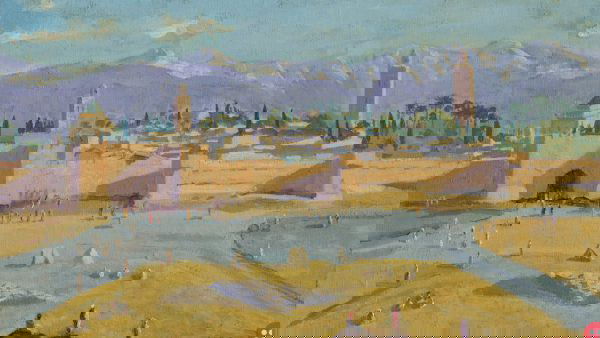 This rare painting called “Tower of Koutoubia Mosque” features a Moroccan landscape and shows the image of the 12th-century mosque in Marrakech at sunset. The majestic Atlas Mountains are seen in the background.