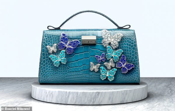 Priced at 6 million euros (£5.3million), the bag is made from semi-shiny alligator skin. The bag is also embellished with 10 white gold butterflies. Four of these butterflies are decorated with diamonds while three each are adorned with sapphires and rare paraiba tourmalines, totalling over 130 carats.