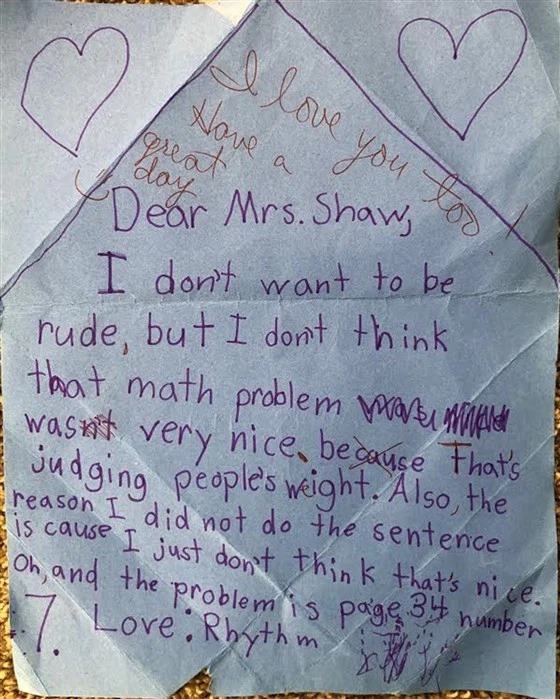 Rhythm also wrote a note for her teacher explaining why she did not solve the question. She wrote, “Dear Mrs. Shaw, I don’t want to be rude, but I don’t think that math problem was very nice because that’s judging people’s weight. Also, the reason I did not do the sentence is cause I just don’t think that’s nice. -Love Rhythm”