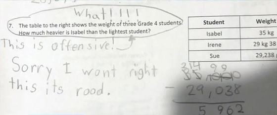 Rhythm thought the question was rude and offensive and refused to solve it. She encircled the question and wrote “what!!!!” adding that, “This is offensive. Sorry I won’t right [write] this it’s rood [rude].”