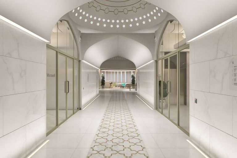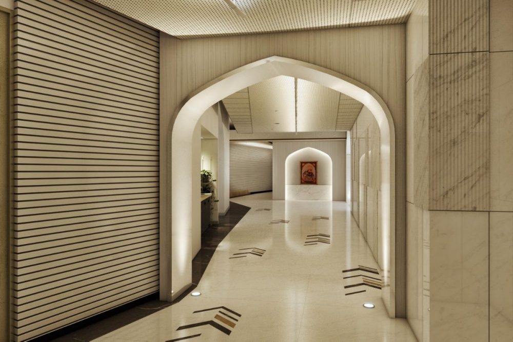 The symmetrical and decorative aspects of the Mughal architecture have been incorporated into the office, as have the minarets, domed ceilings, arched entrances, and the distinctive jaali work, which is a Mughal architectural style of perforated stone or latticed screen. Like the Taj Mahal, this office is dominated with ivory hues.