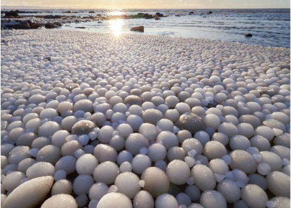 As a result of a rare weather phenomenon, the visitors saw a huge number of egg-shaped balls of ice of varied sizes on a beach!