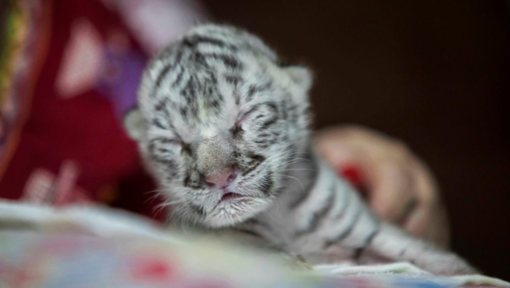 Born to a pair of yellow and black coloured Bengal tigers, Nieve had been rejected by its mother because she could not produce enough milk and is currently being raised by humans.