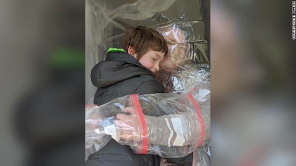 Using some inventiveness and creativity, Shelby put into place around 12 reusable bags to make a plastic barrier, with arm holes on the front door of their home. This ‘Quarantine Hugs’ set up also has a stool for the second graders to climb upon. It also has a container for a range of disinfectants.