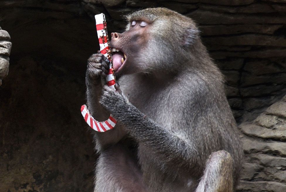 Here is a baboon earnestly relishing its Christmas treat at the Cali Zoo in Colombia. Isn’t this an amazing picture?