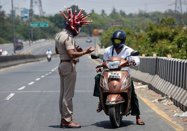 The helmet bears an uncanny resemblance to the coronavirus and has been designed by a local artist, Gowtham.