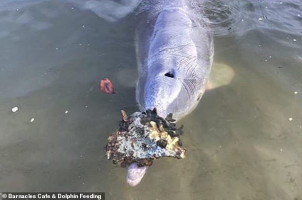 Interestingly, there are seven dolphins in the wild dolphin feeding program but Mystique is the only one that has this generous habit.