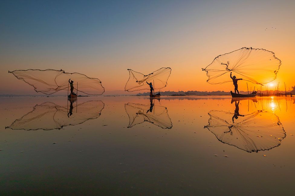 The picture depicts three fishermen in Myanmar throwing their fishing nets in the lake near U Bein Bridge, in Mandalay.
