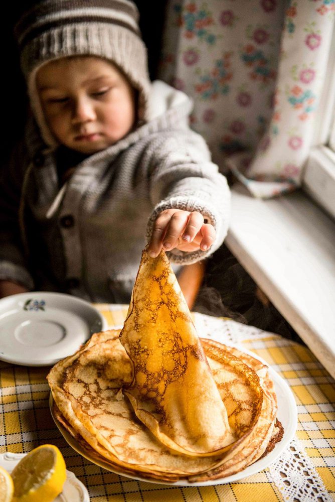 This picture shows the Olek, son of photographer Anna Wlodarczyk eating pancakes in their summer Kashubian house.