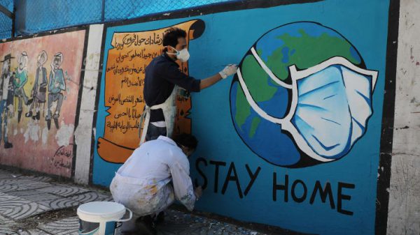 This one is from Gaza, where Palestinian artists draw a beautiful mural spreading awareness of the benefits of staying home to curb the spread of the coronavirus.