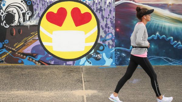 Here is one from the promenade at Bondi Beach in Sydney, where an emoji is shown wearing a protective mask.