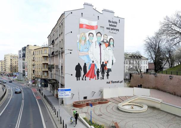 Here is one from Poland that pays tribute to Polish medical professionals during the coronavirus pandemic with the words “Not every hero wears a cape” in Warsaw, Poland. The mural is the creation of Na Temat, a progressive new website, which said it was a gesture of thanks to all the doctors, nurses, paramedics and other health care providers who are offering care and saving lives at this difficult time.