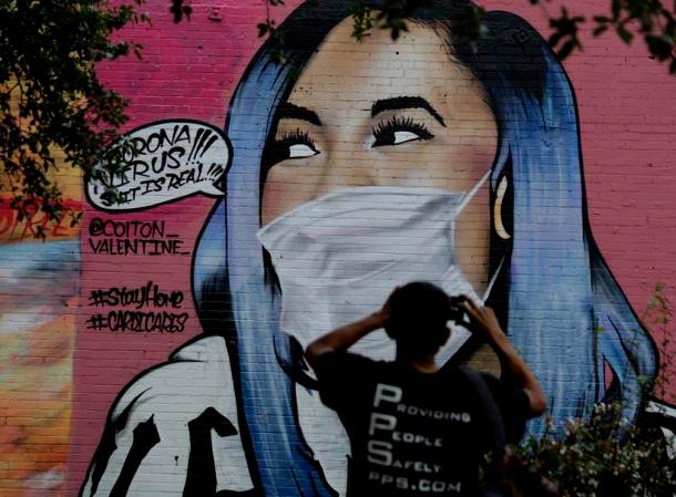 A man photographs a mural of Cardi B that was updated by the artist Colton Valentine to include a face mask to reflect the coronavirus pandemic, in San Antonio.