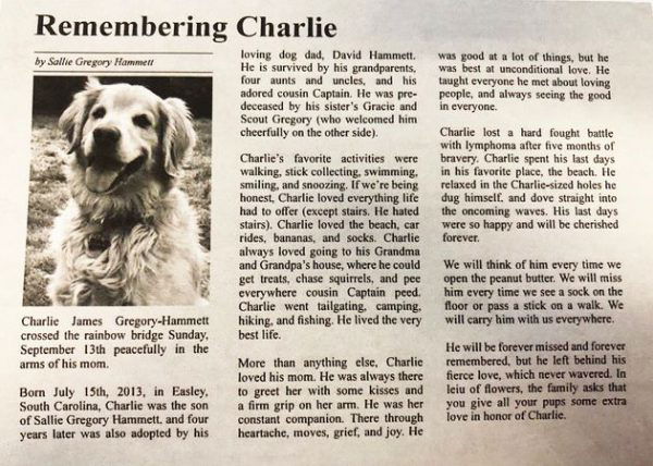 Unfortunately, this year in September, Charlie passed away after fighting lymphoma for five months. Sallie was shattered by this insurmountable loss and decided to pour out her feelings by writing an obituary for her beloved pet.